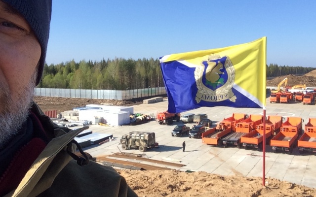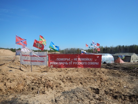 На этой территории поставлены ангары, казарма-общежитие, столовая, две вертолетные площадки и другие сооружения. Огромные горы песка и гравия, большие площади застелены аэродромными плитами. Лес на всей территории вырублен. По всей территории установлены посты охранной фирмы, обеспечивающей безопасность объекта. И на этой большой территории - маленький островок, состоящий из палаток, несколько грубо сколоченных столов для приема пищи, место для костра и много флагов и баннеров. Есть еще несколько лагерей протестующих, поменьше и они расположены на подъезде с станции Шиес. Очень символичны название этих пунктов; Ленинград, Сталинград и т.д.