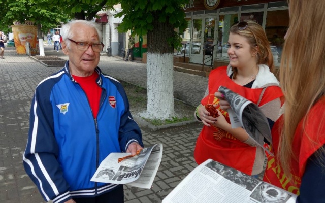 Раздача георгиевских лент не ограничилась одним днём. 6 мая активисты "РОДИНЫ" продолжили вручение этих памятных символов на следующий день вместе с очередным патриотическим выпуском газеты новочеркасского отделения.