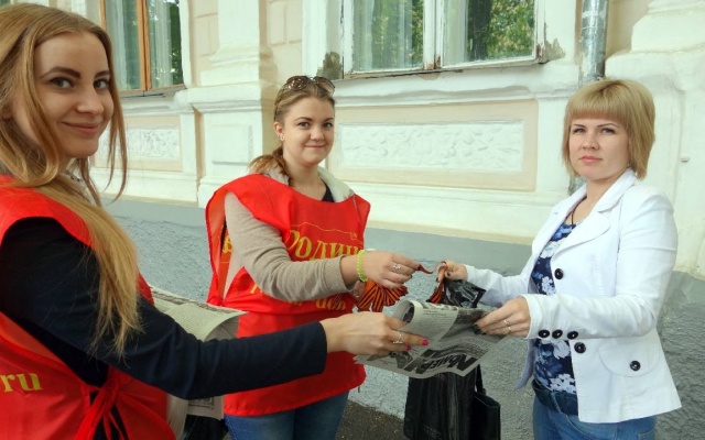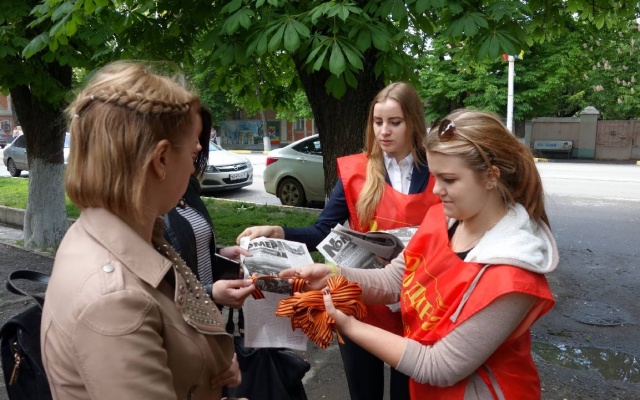 В завершении мероприятия студенты и старшеклассники школ города раздали георгиевские ленточки.